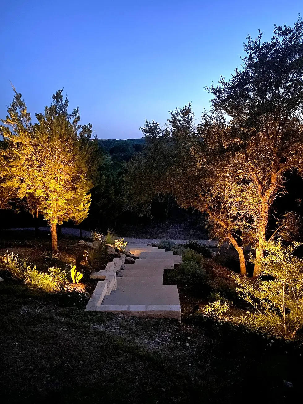 This client came to us through a builder we trust, ready to transform their newly remodeled home with a large outdoor living space featuring an Ipe deck and covered kitchen. To make the most of the full landscape, we designed pathways and cozy spots down the slope - whether you’re enjoying the amazing views from the kitchen, deck, or fire pit, or relaxing in a hammock or on the trampoline for some privacy. Flowering desert willows frame the pool, and a gravel seating area breaks up the deck’s living spaces. Planters surround the deck, eliminating the need for railings while adding natural charm. Up front, we created a desert-style courtyard by the entryway and finished the street-facing planters with agaves and feather grasses for a cohesive look.